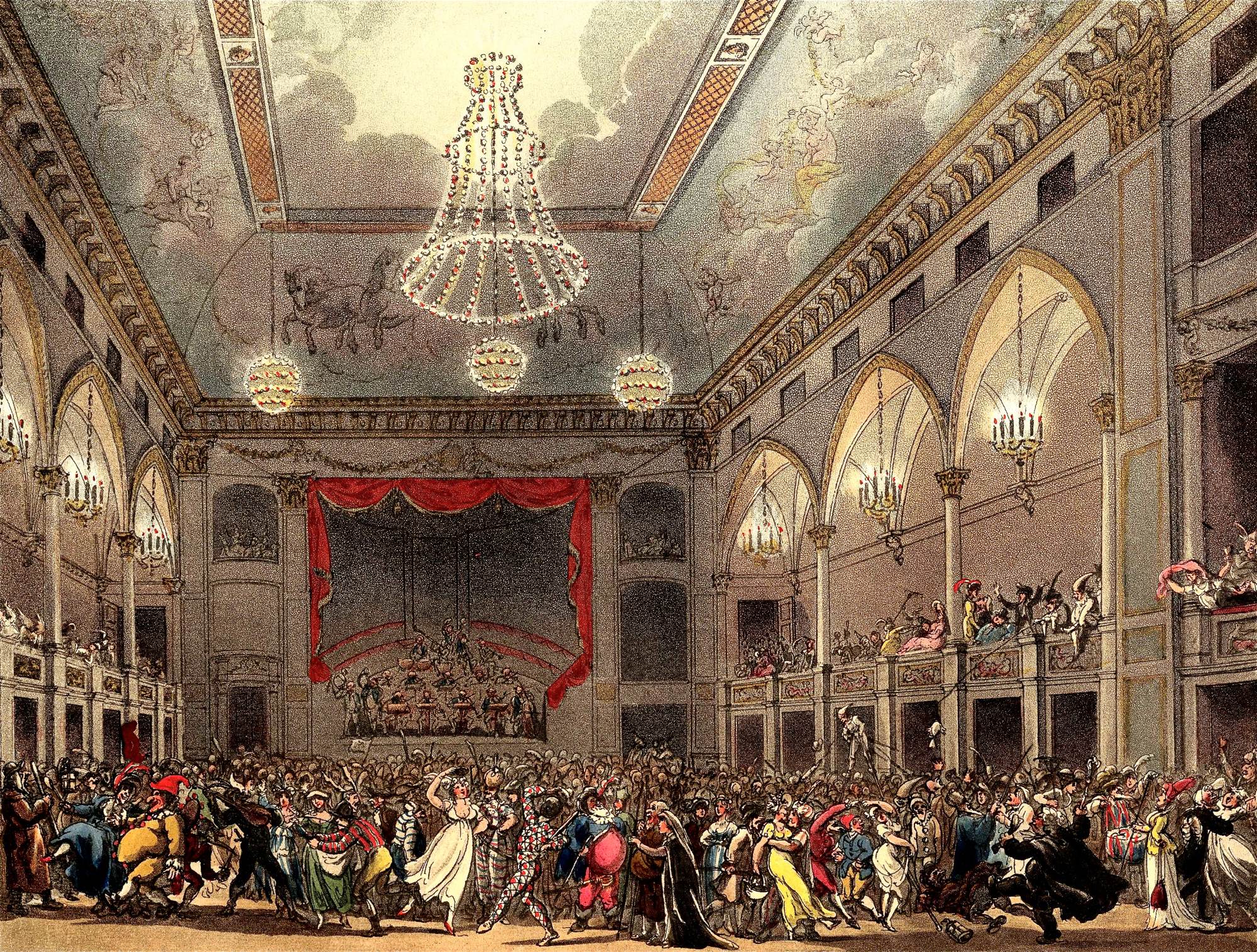 De acordo com um jornal da época, o primeiro entretenimento realizado por lá foi uma festa a fantasia com convites cobiçados, no dia 2 de junho de 1806, para mais de 500 pessoas. Um verdadeiro estouro! Até mesmo o Príncipe de Gales (que viria a ser regente em alguns anos) participou da festa. Segundo o registro, algumas fantasias incluíam um cocheiro, um marinheiro, uma plebeia, um veterano de guerra e até um médico que passeava pelo salão medindo a pressão das participantes.