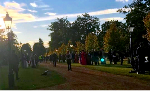 Outra locação foi no Windsor Great Park, no qual está o Windsor Castle. O parque é gigantesco e a foto (que conseguimos obter na hashtag e que o dono nos permitiu usar) não dá muitas pistas de onde pode ser. Principalmente porque eu acredito que eles instalaram esses postes de luz aí., mas posso estar errada. Ao que parece, o local está fazendo as vezes do Hyde Park, com essa configuração da foto lembrando muito a Rotten Row.