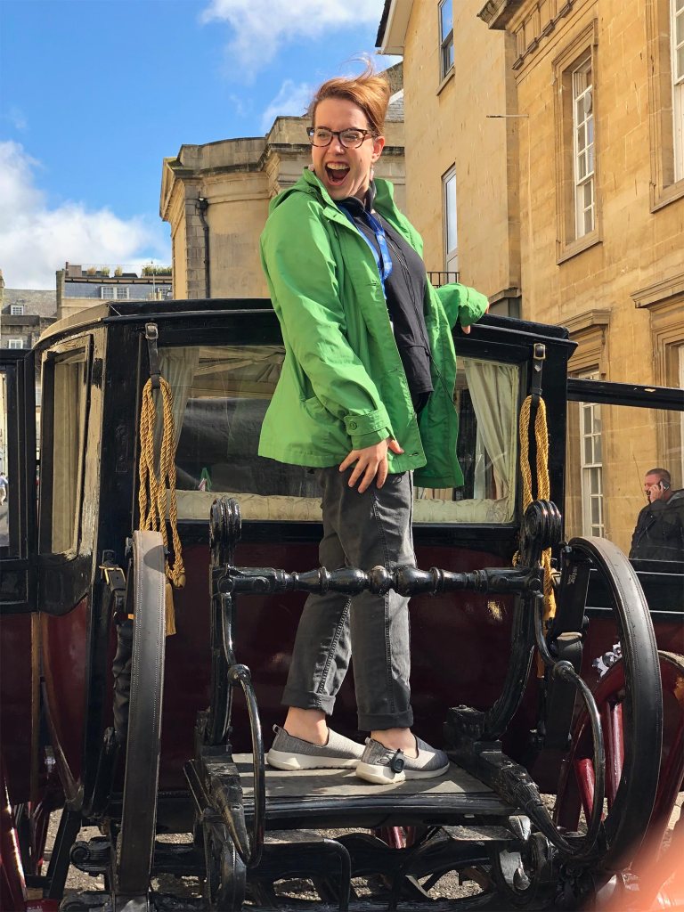 Falando sobre suas visitas ao set, ela contou que a fizeram entrar com olhos fechados no estúdio para surpresa ser maior e que toda a estrutura é enorme. Ela até compartilhou uma foto com a repórter em cima de uma carruagem durante sua visita ao set em Bath.