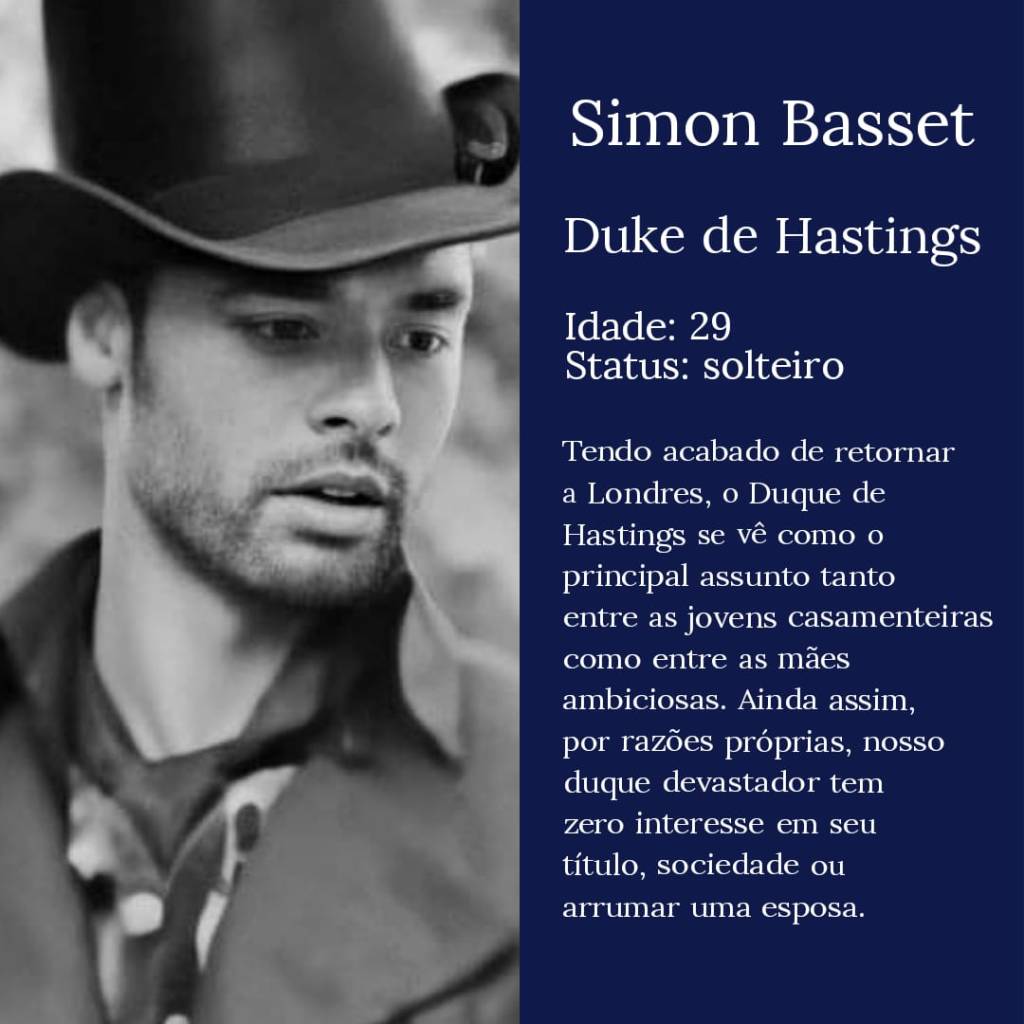 Simon Arthur Henry Fitzranulph Basset. Sim, esse é o nome completo do nosso amado 10º Duque de Hastings. Simon nasceu em 1784 no início de abril no Castelo de Clyvedon (Olá, Áries). Sua mãe morreu no parto e seu pai, o nono duque, não demonstrou uma única gota de carinho por seu próprio filho.