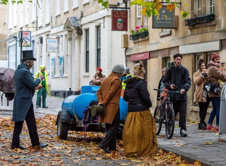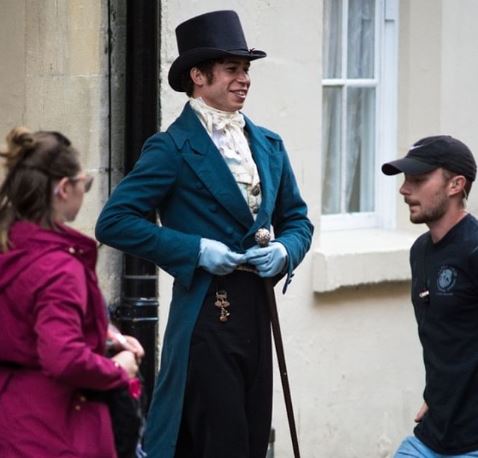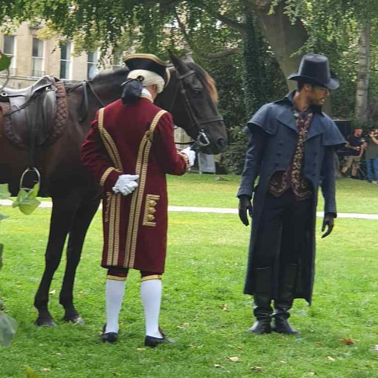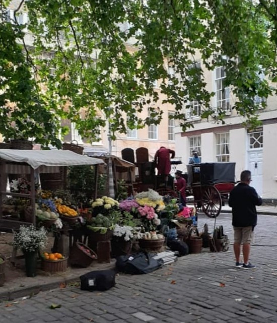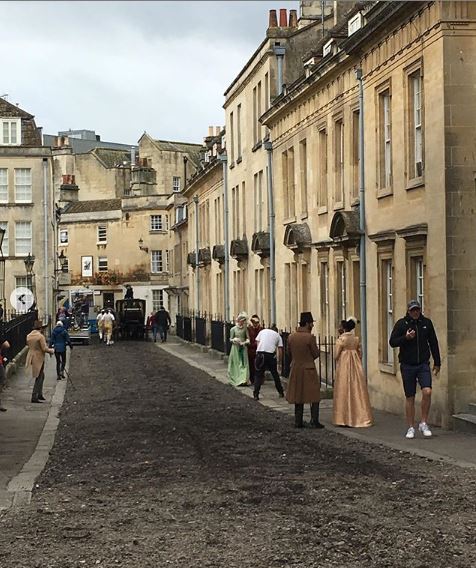 Bailes, o que mais? Sabemos que um dos salões do Assembly Rooms foi todo decorado para filmagens, mas não sabemos qual baile será representado ali. Seria o de Lady Danbury? Provavelmente, uma vez que durante o período de filmagens no Assembly Rooms, em agosto, o ator Jamie Beamish, que interpretará Nigel Berbrook, estava na cidade com o elenco. Editado em 30/5: encontrei uma reportagem em um jornal britânico que confirma que o jardim do Holbourne Museum e o Assembly Rooms vão formar a mesma residência!