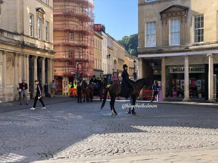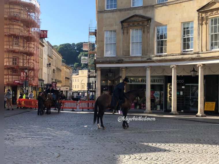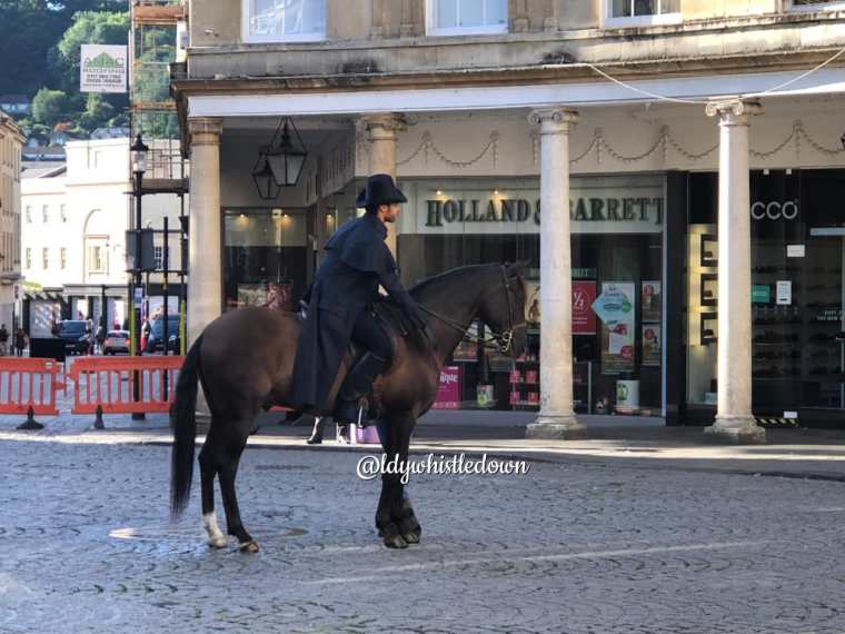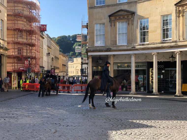 Em frente ao Pump Rooms tivemos um belo vislumbre de Simon Basset todo poderoso em cima de seu garanhão negro. Possivelmente, cenas de transição de Simon chegando a Londres depois de anos fora.