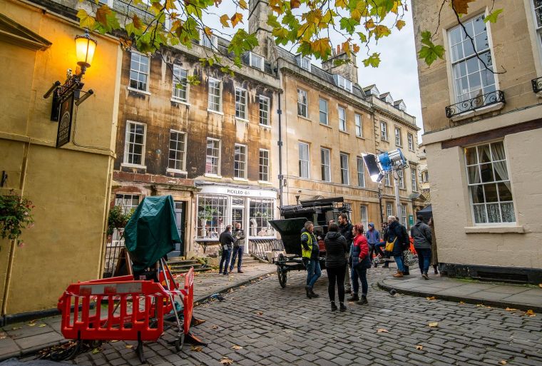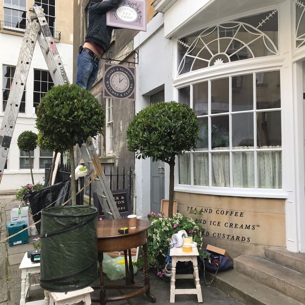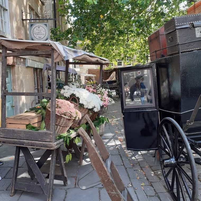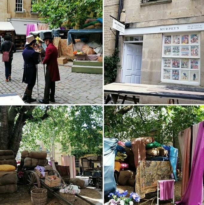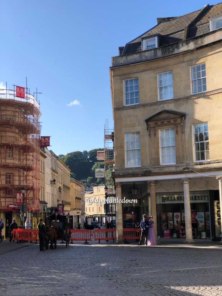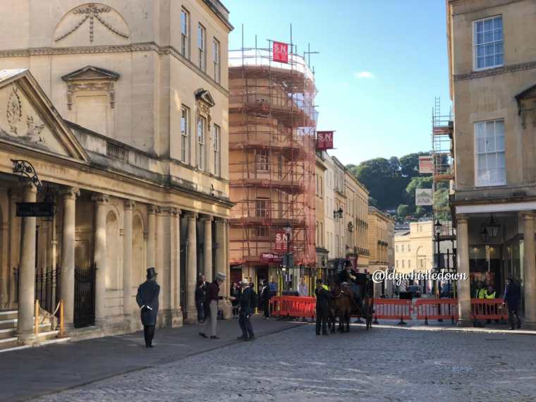 Essas localizações são praticamente a mesma rua, mas que muda de nome em determinado ponto. Tudo indica que é a recriação da Bond Street. Na Beauford Square vimos mais cenas com carruagens e cavalos sendo gravadas. Já na Trim Street, uma loja foi transformada em um empório de chapéus e uma loja de azulejos se transformou na Gunter’s, famosa sorveteria regencial. Foi na Trim Street inclusive que vimos Eloise, Penelope e também Daphne, graças aos stories do IG Malas pra que te quero.