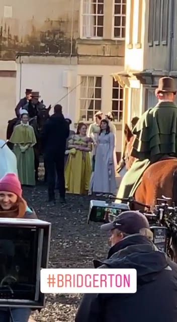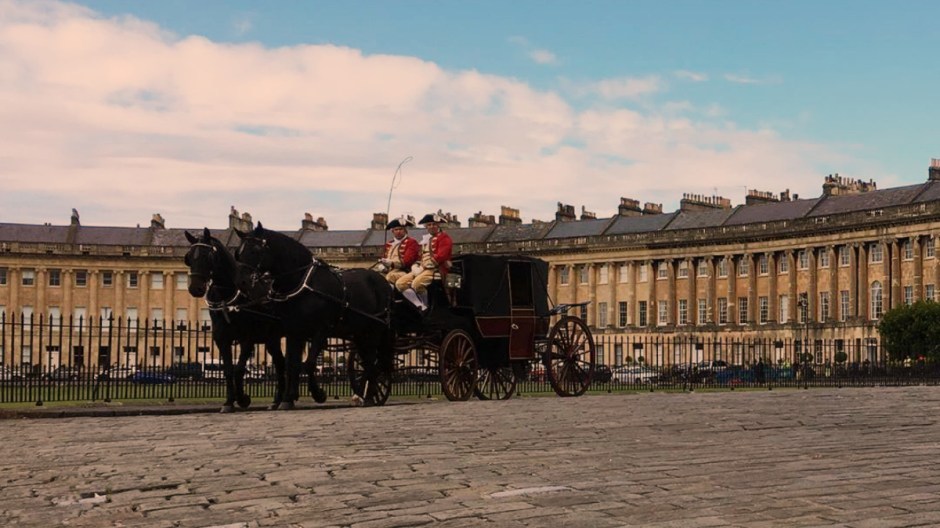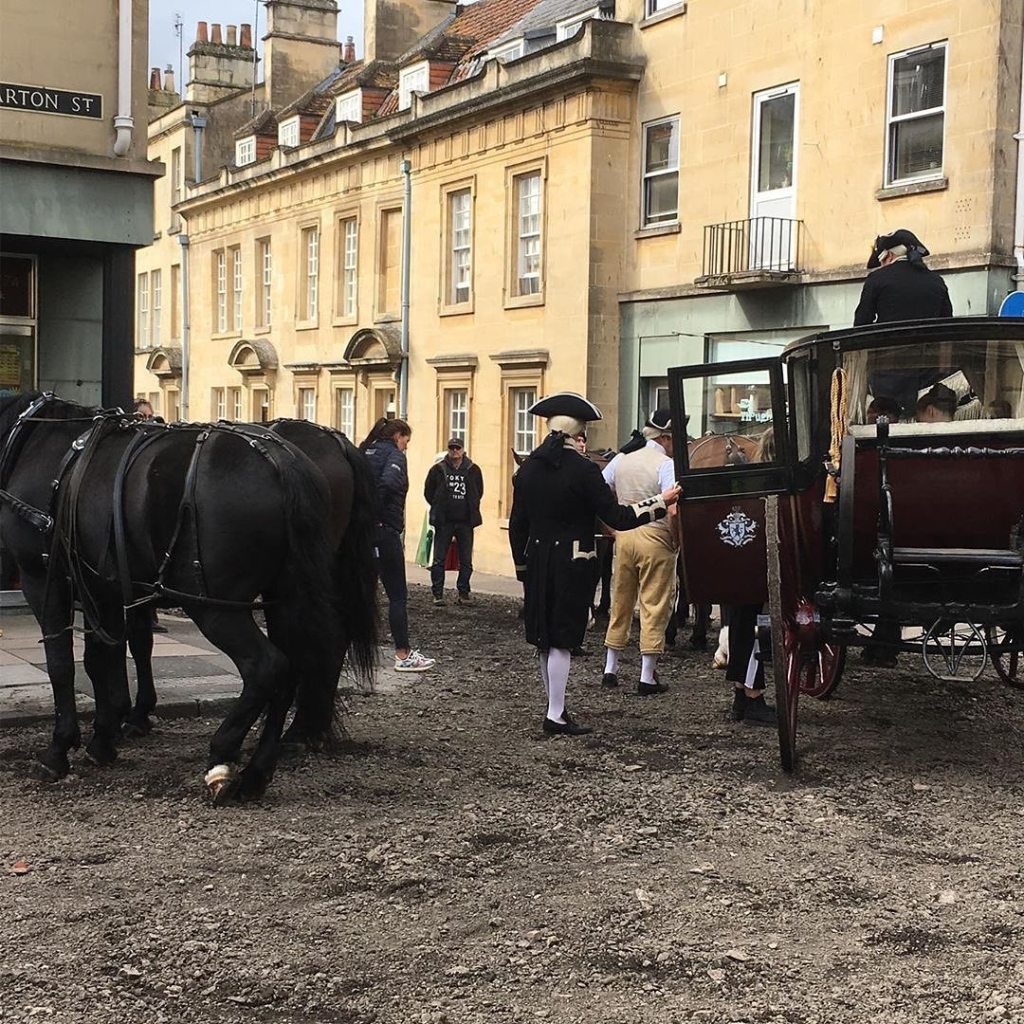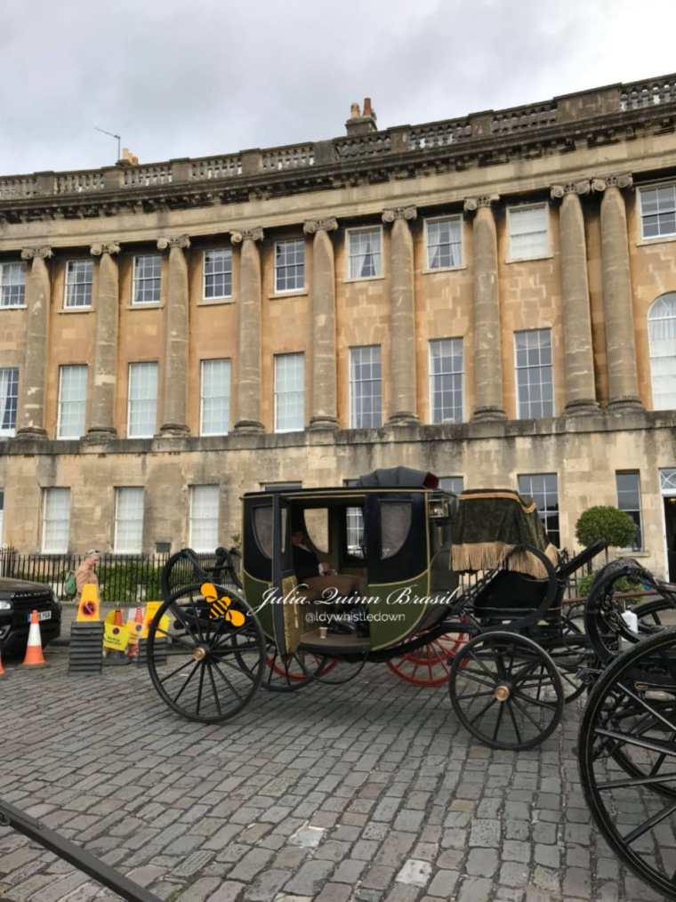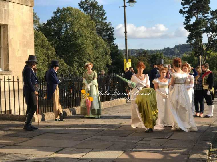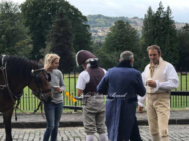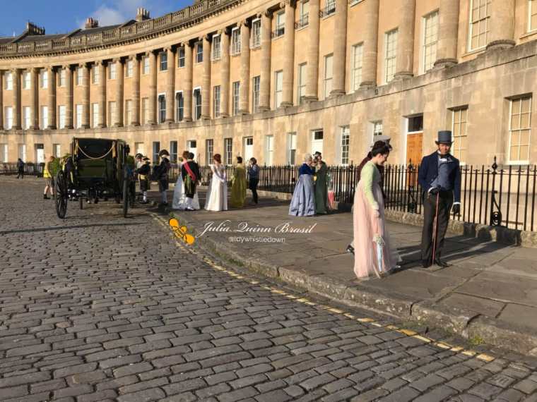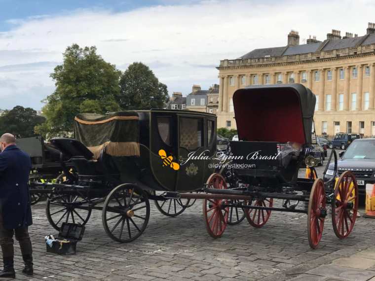 Já sabemos por fato que o Royal Crescent Nº1 será a fachada da Casa Featherington, e foi ali que vimos a família caracterizada pela primeira vez. Por meio de um grupo no Facebook, recebemos algumas fotos inéditas das filmagens por lá, com direito a close na carruagem Bridgerton (no qual podemos ver o brasão, com o moto Familia Ante Ominia) e até o grupo de dublês das Featheringtons esperando para embarcar na carruagem (pensa na taquicardia que tive por dois segundos até perceber que eram dublês e não as atrizes oficiais).