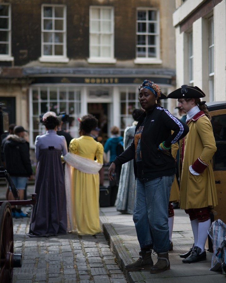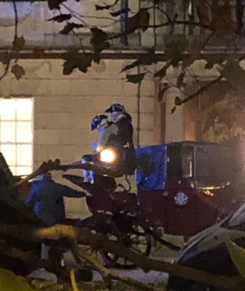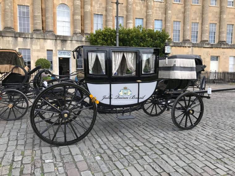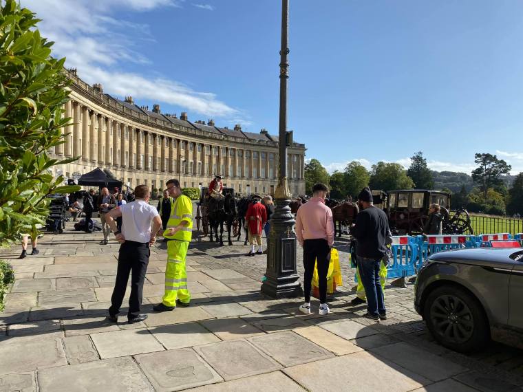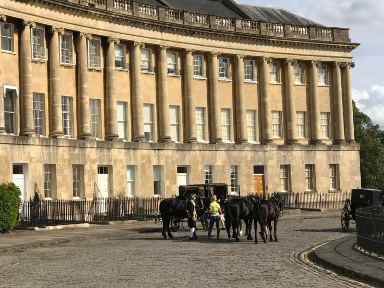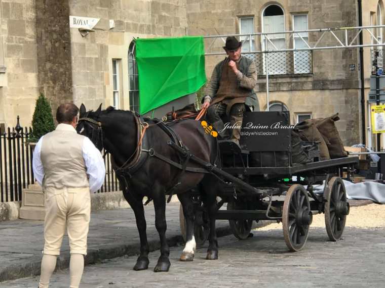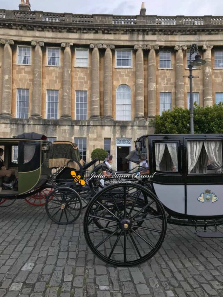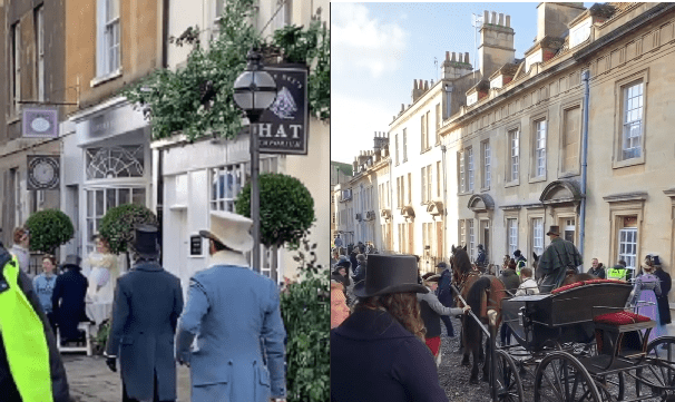 Já sabemos por fato que o Royal Crescent Nº1 será a fachada da Casa Featherington, e foi ali que vimos a família caracterizada pela primeira vez. Por meio de um grupo no Facebook, recebemos algumas fotos inéditas das filmagens por lá, com direito a close na carruagem Bridgerton (no qual podemos ver o brasão, com o moto Familia Ante Ominia) e até o grupo de dublês das Featheringtons esperando para embarcar na carruagem (pensa na taquicardia que tive por dois segundos até perceber que eram dublês e não as atrizes oficiais).