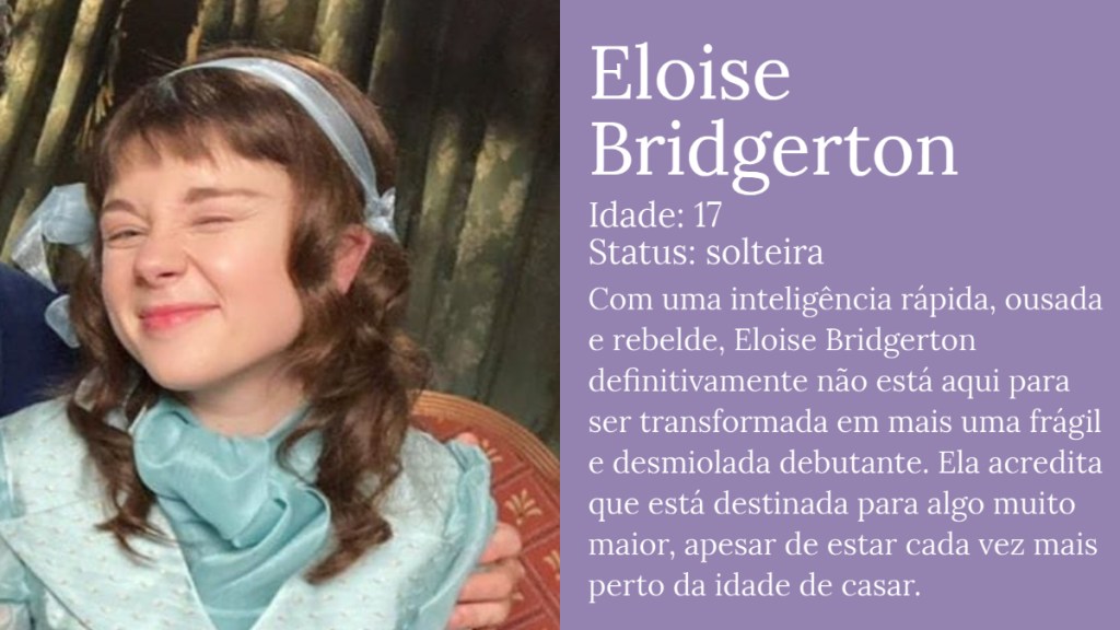 Continuando nosso alfabeto, agora é hora de conhecer Eloise melhor. A segunda menina e quinta filha dos Bridgertons, nossa pequena senhorita tem um traço rebelde e não acredita em ser uma debutante frívola e cheia de babados.