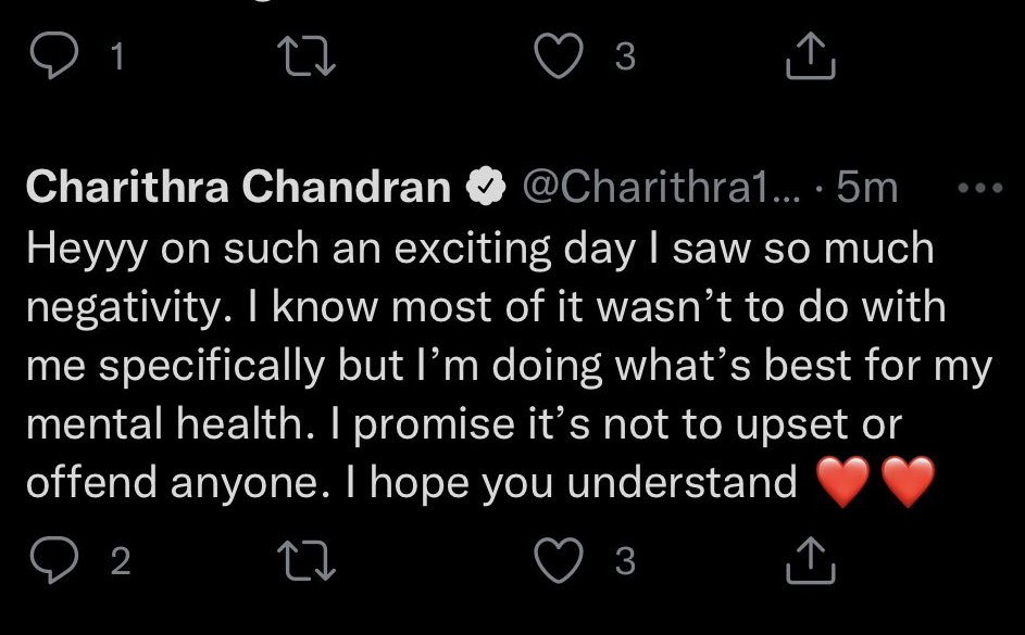 Charithra Chandran bloqueou algumas contas no Twitter que julgou não estarem fazendo bem para a saúde mental dela. Mesmo que os comentários raivosos sejam direcionados ao modo como a Netflix e a Shondaland estão divulgando a série, não deve ser nada fácil se ver apagada do poster principal da temporada. Chari fez o que precisava fazer para manter a mágica do momento. E não sendo suficiente bloquear, ela desativou o Twitter nesta quinta-feira.