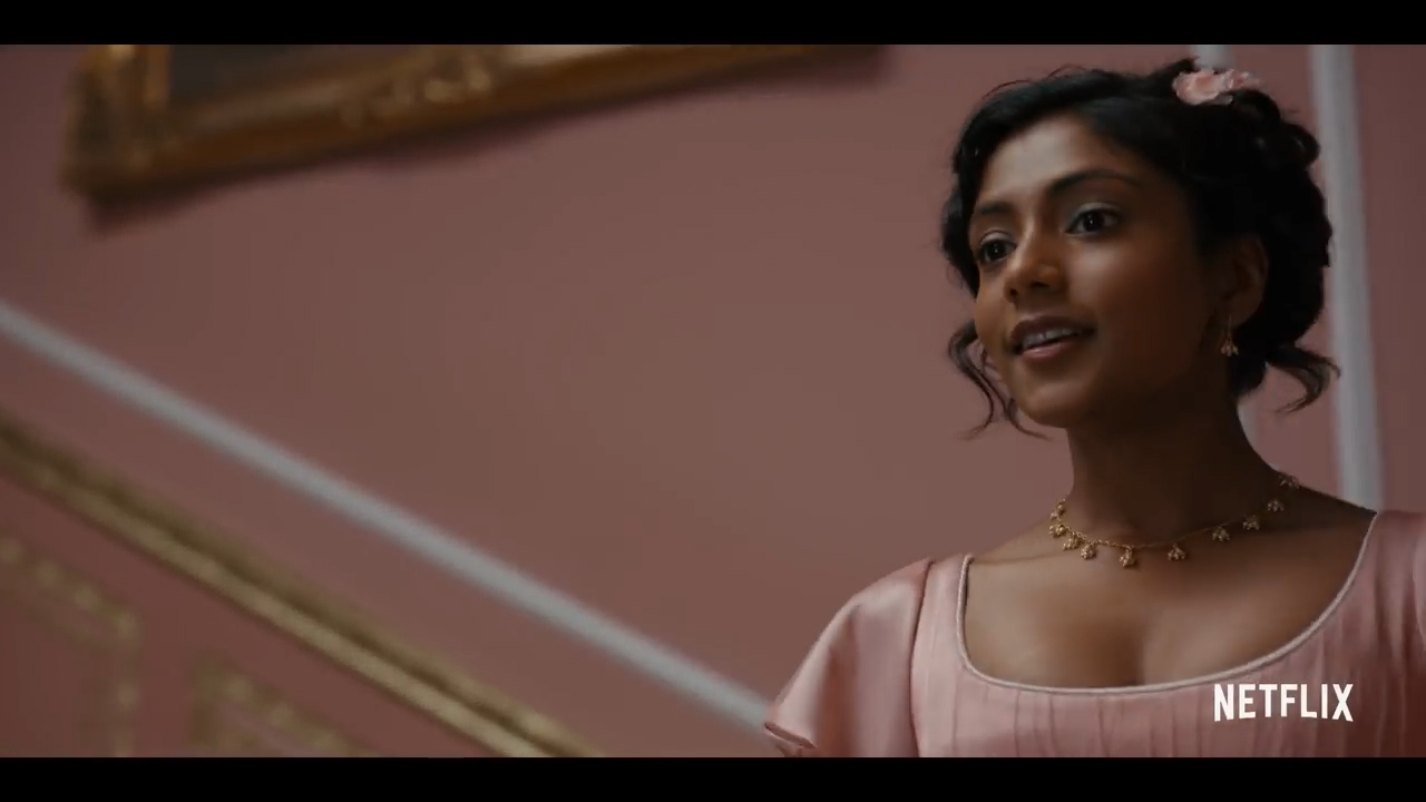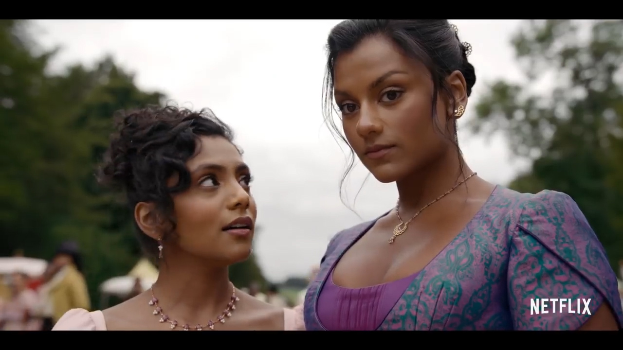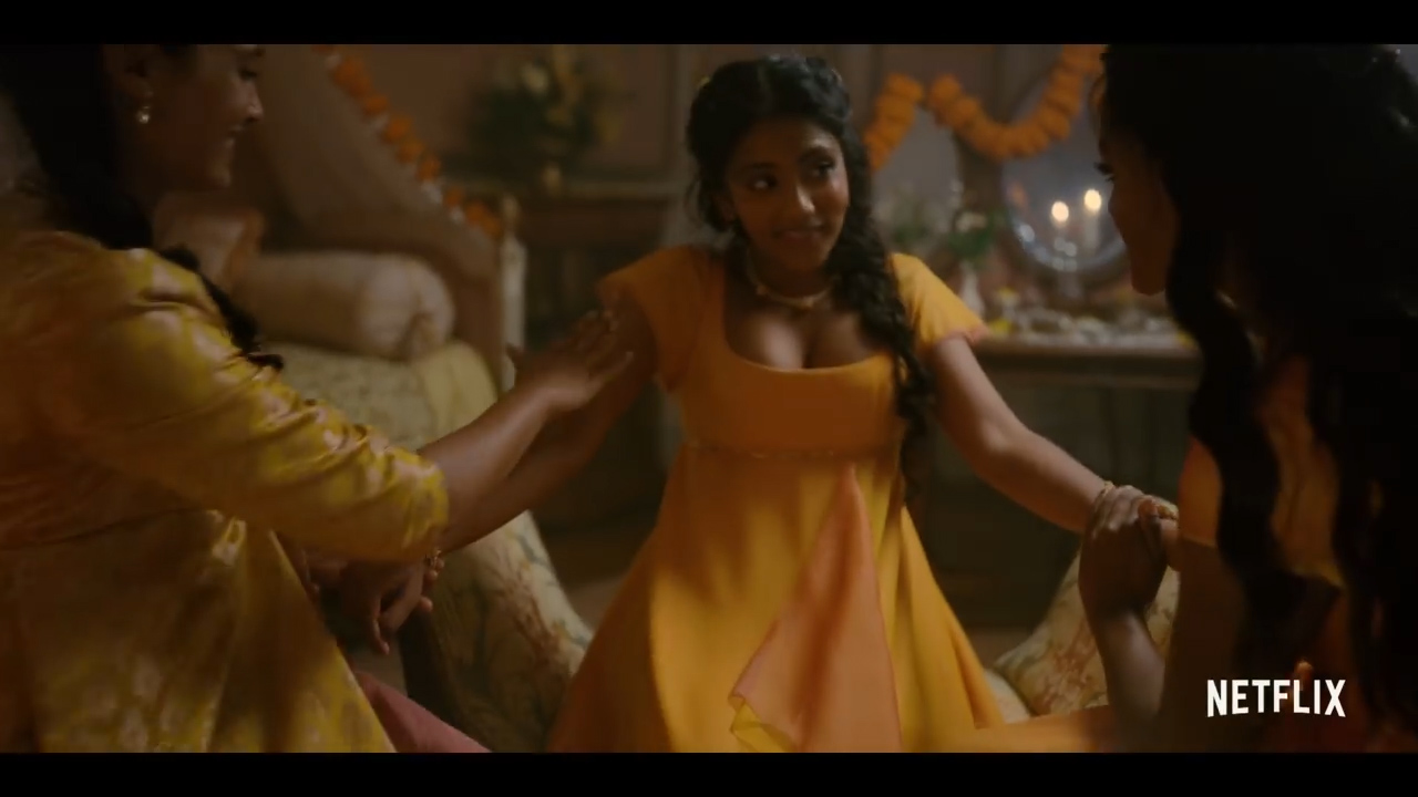 O trailer tem aquele ritmo alucinado que só Shondaland é capaz de trazer, com muitas cenas que nos deixaram babando e teorizando mil maluquices! Destaque para a cena em que Kate e Mary passam açafrão em Edwina, ritual indiano tradicional chamado de Haldi, e que antigamente era feito apenas por mulheres casadas. Pela cara de alegria de Kate, provavelmente ela está aliviada que a irmã está casando por amor (e que ela é a Viscondessa Bridgerton).