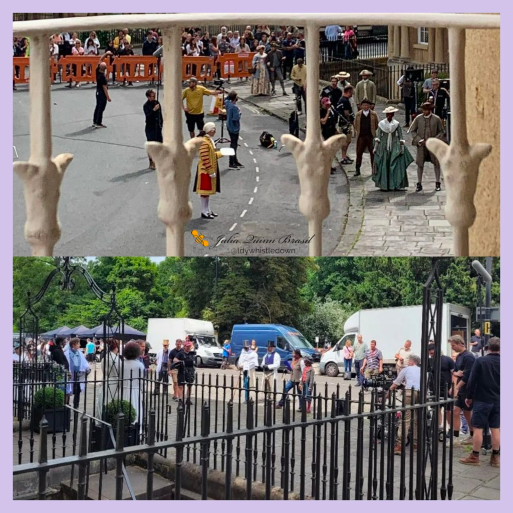 Ao mesmo tempo, outra unidade filmava no Kings Circus, pertinho do Royal Crescent (Casa Featherington). Entretanto, por ali as roupas eram bem ao estilo do século 18, da Era Georgiana (que antecede a Era Regencial).