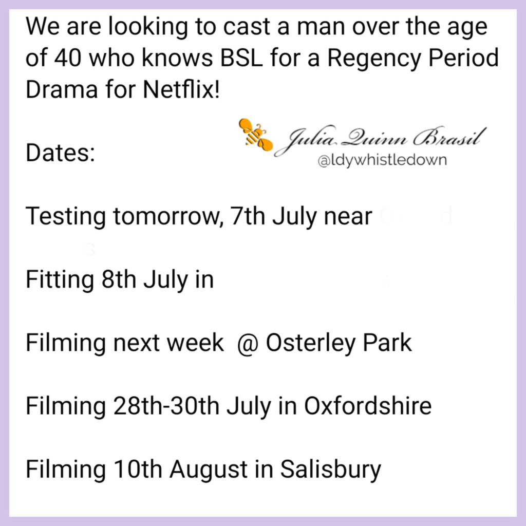 O santo graal dessa busca foi uma chamada de elenco que procura alguém com mais de 40 anos e que saiba se comunicar em BSL, a linguagem britânica de sinais, para uma série regencial da Netflix. BINGO! O print confirma Osterley Park como locação de Bridgerton nesta semana e entrega duas regiões que conhecemos bem das temporadas anteriores.