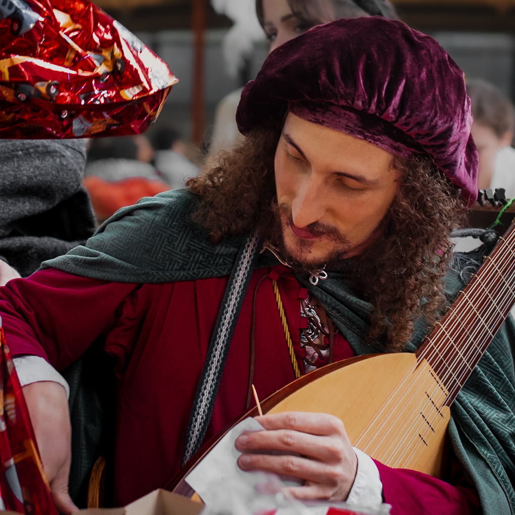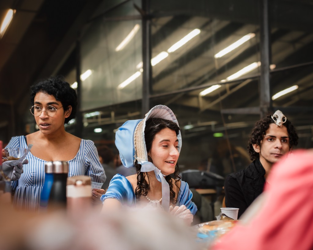 As mesas transbordavam de comidas salgadas e doces, muitos sucos e chás para aguentar o frio que fazia. Nessa hora, ninguém reclamou dos trajes terem tecidos pesados! Passei frio apenas nos braços, já que o fino fichu improvisado com uma meia-calça, apesar de ajudar, não segurou o vento tanto quanto eu esperava.